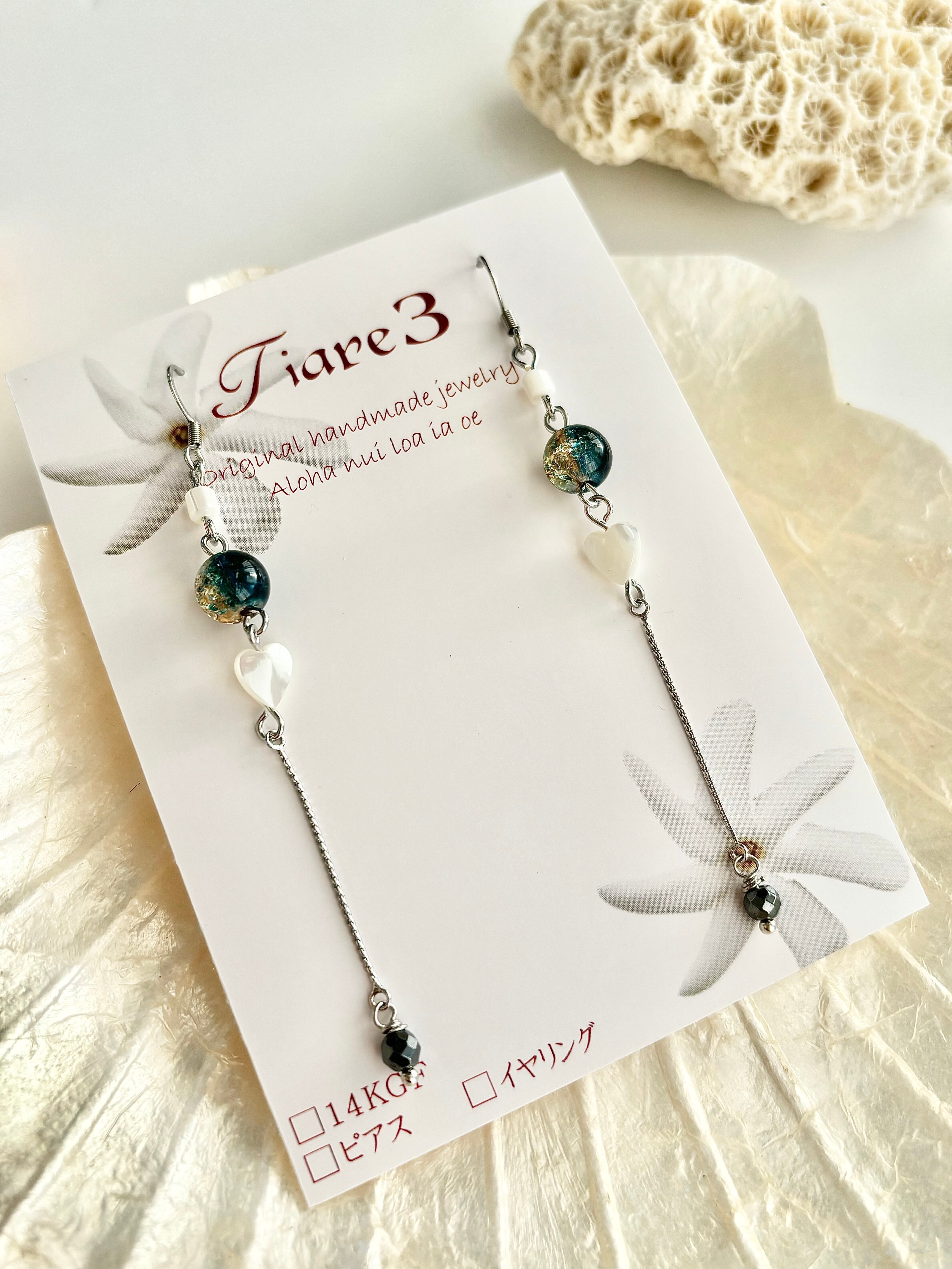 海色ビーズ マザーオブパール ハート ヘマタイト シルバー ピアス